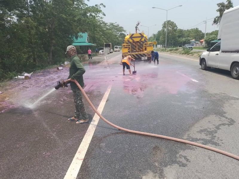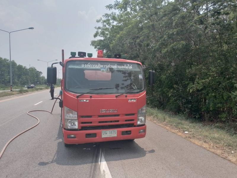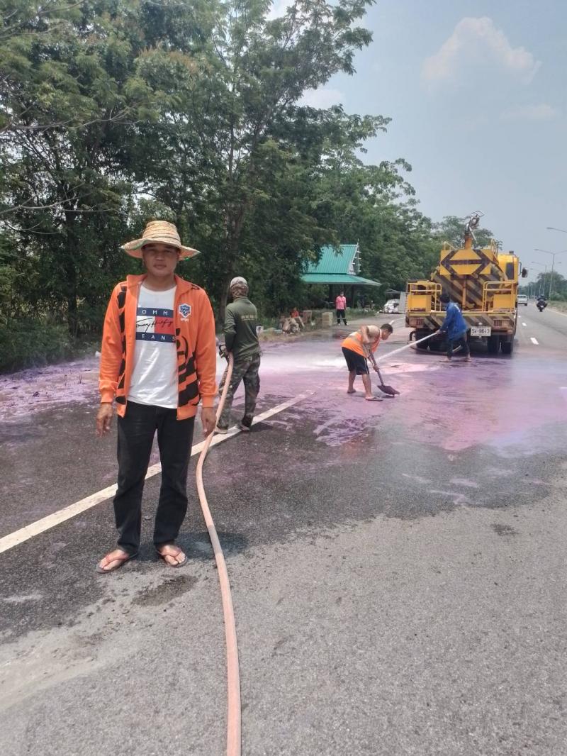 งานป้องกันและบรรเทาสาธารณภัยองค์การบริหารส่วนตำบลค้อใต้ลงพื้นที่ฉีดล้างถนนบริเวณหน้าเรือนจำอำเภอสว่างแดนดิน เนื่องจากรถบรรทุกสียางระเบิด