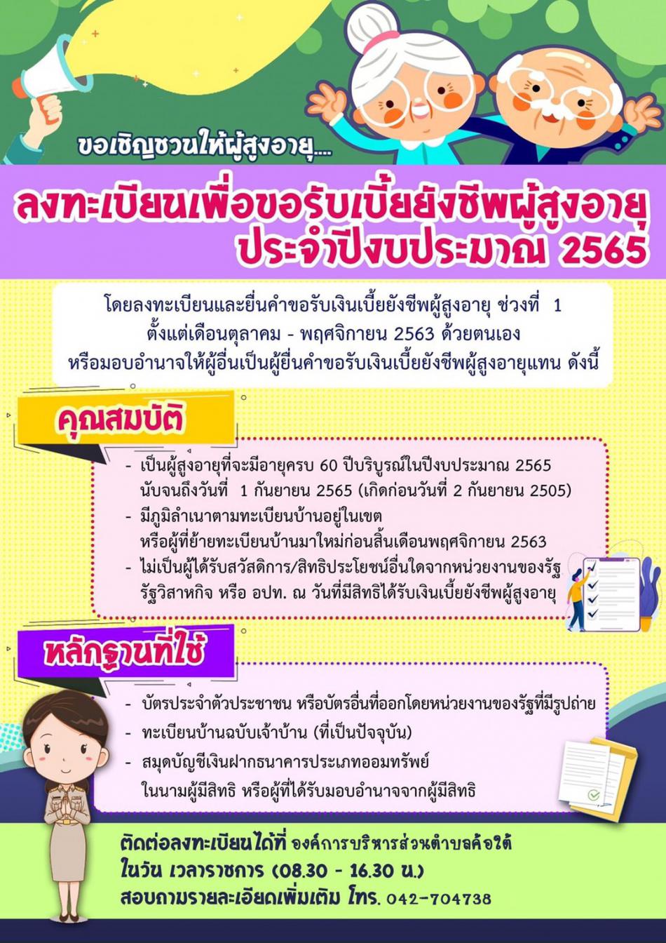 ประชาสัมพันธ์การลงทะเบียนเพื่อขอรับเบี้ยยังชีพผู้สูงอายุ ประจำปีงบประมาณ พ.ศ. ๒๕๖๕