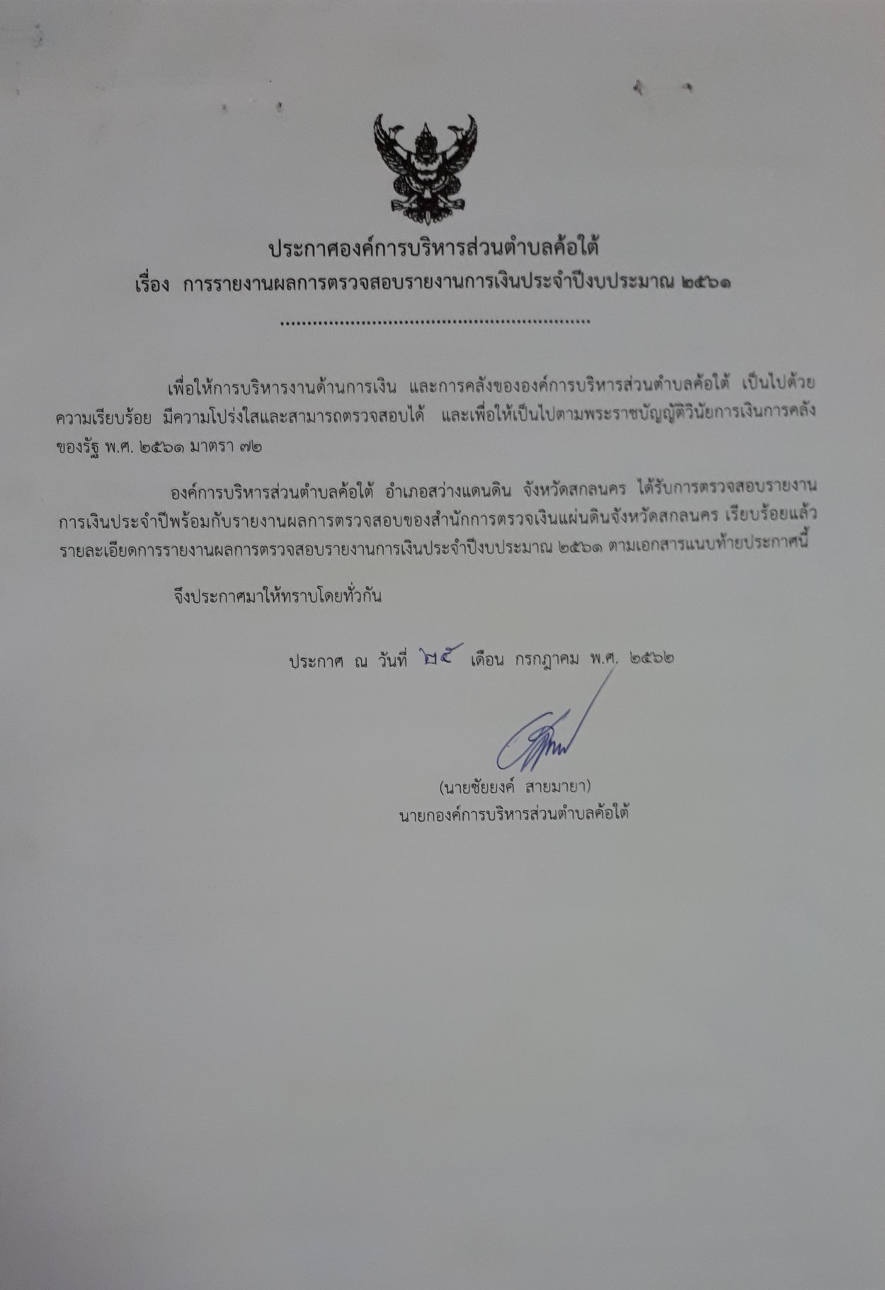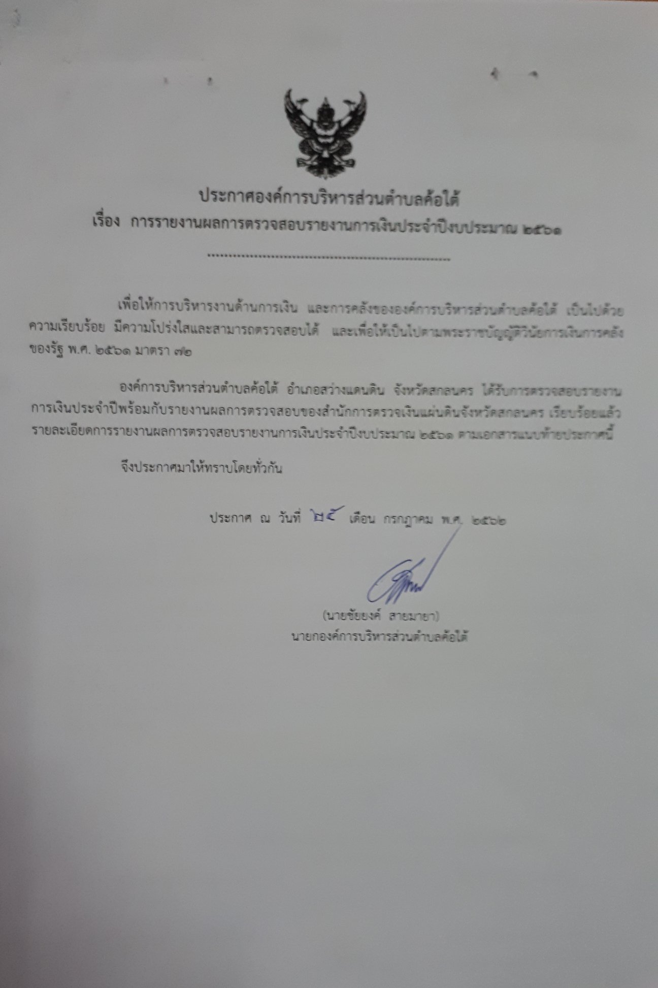 ประกาศองค์การบริหารส่วนตำบลค้อใต้ เรื่อง การรายงานผลการตรวจสอบรายงานการเงินประจำปีงบประมาณ 2561