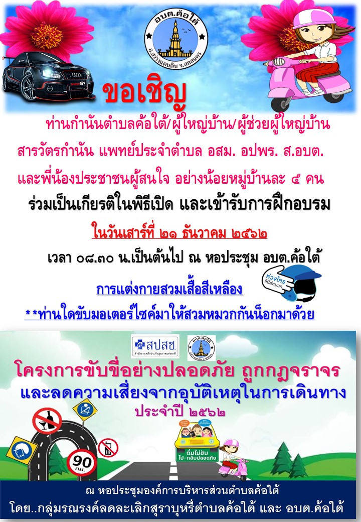 ประชาสัมพันธ์เชิญชวนผู้สนใจเข้ารับการฝึกอบรมโครงการขับขี่อย่างปลอดภัย ถูกกฎจราจร และลดความเสี่ยงจากอุบัติเหตุในการเดินทาง