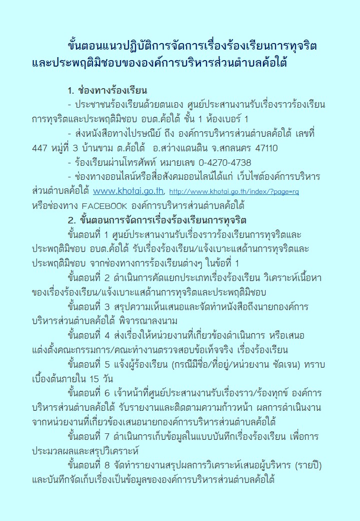 ขั้นตอนแนวปฏิบัติการจัดการเรื่องร้องเรียนการทุจริตและประพฤติมิชอบขององค์การบริหารส่วนตำบลค้อใต้