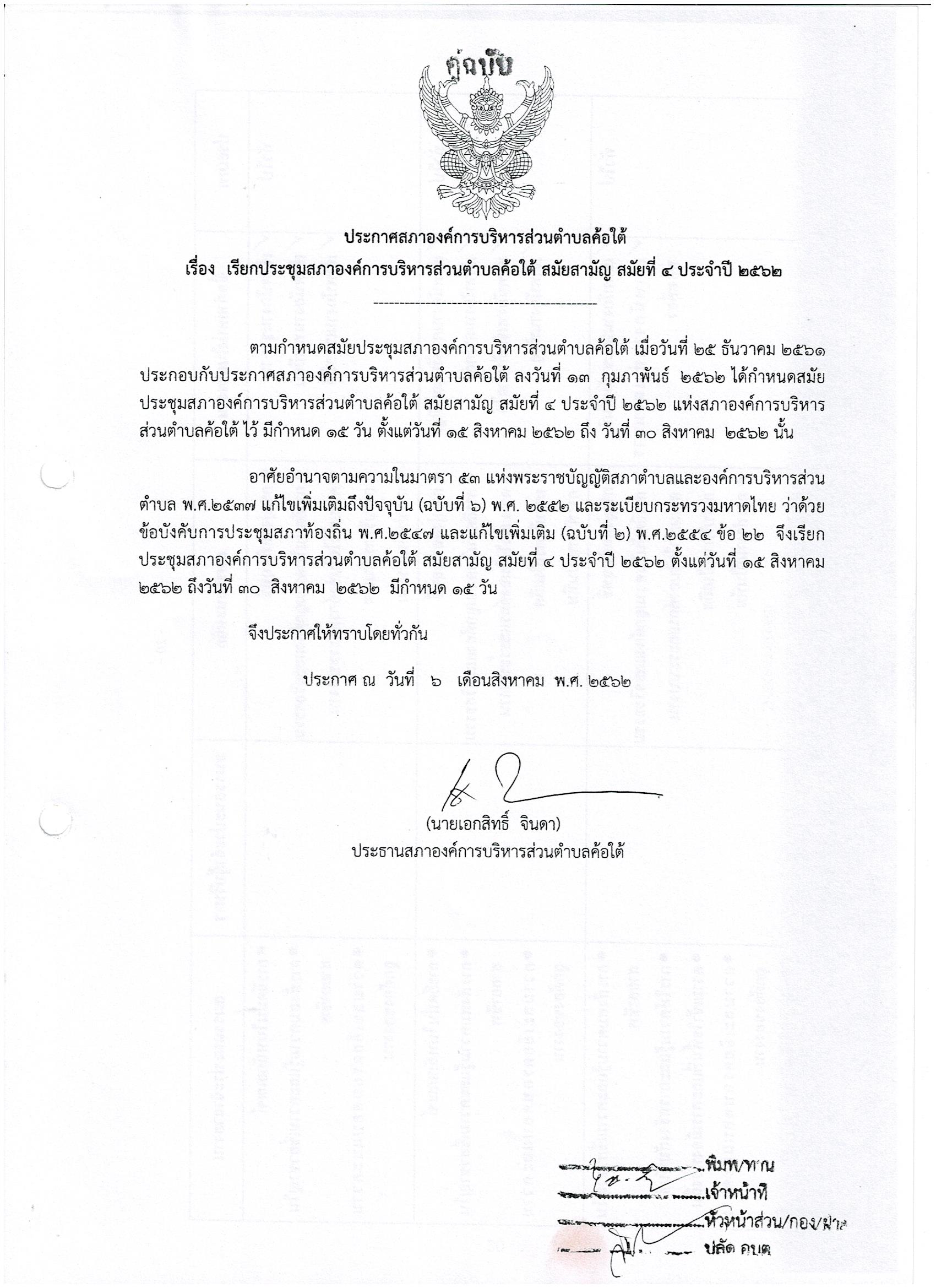 เรียกประชุมสภาองค์การบริหารส่วนตำบลค้อใต้ สมัยสามัญ สมัยที่ 4 ประจำปี 2562