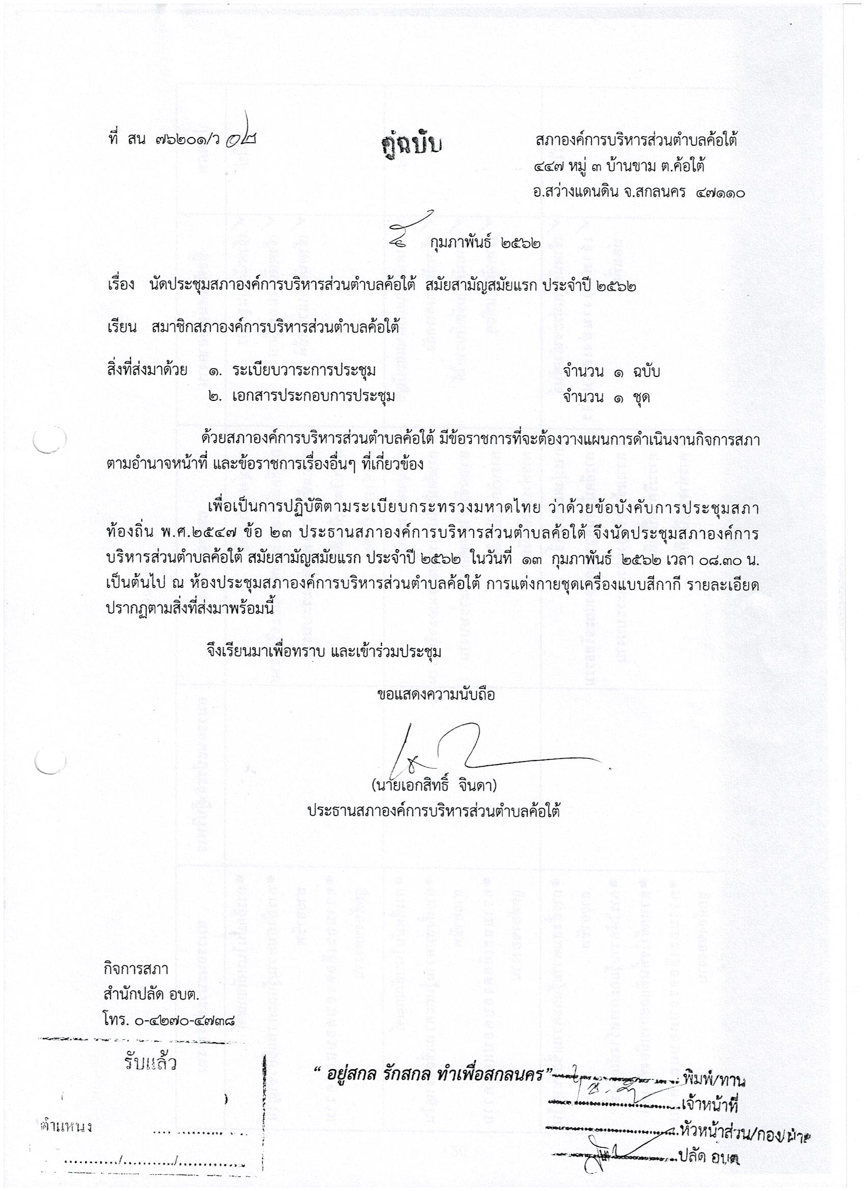 หนังสือนัดประชุมสภาองค์การบริหารส่วนตำบลค้อใต้ สมัยสามัญ สมัยแรก ประจำปี 2562