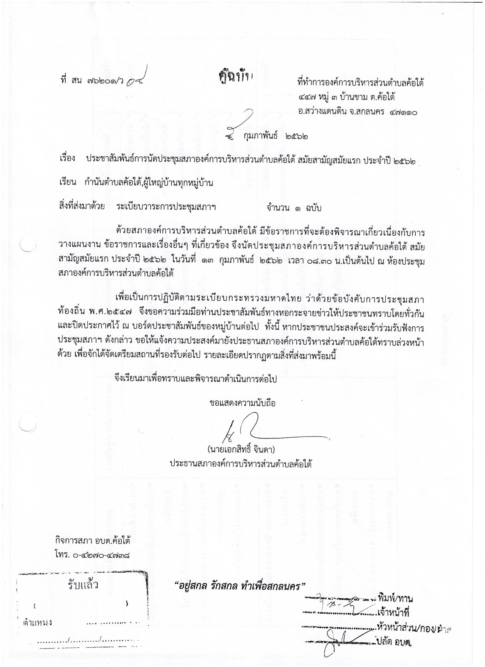 ประชาสัมพันธ์การนัดประชุมสภาองค์การบริหารส่วนตำบลค้อใต้ สมัยสามัญ สมัยแรก ประจำปี 2562