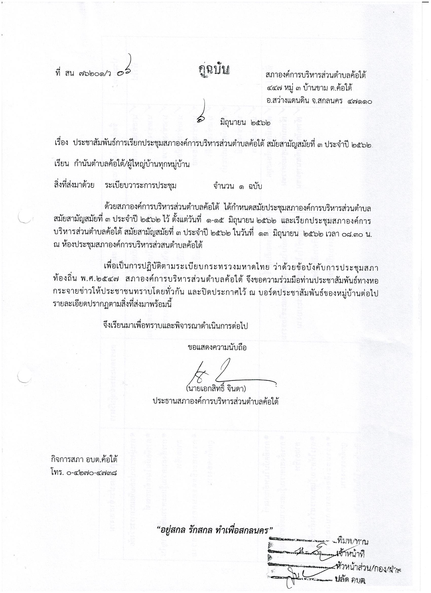 ประชาสัมพันธ์การเรียกประชุมสภาองค์การบริหารส่วนตำบลค้อใต้ สมัยสามัญ สมัยที่ 3 ประจำปี 2562