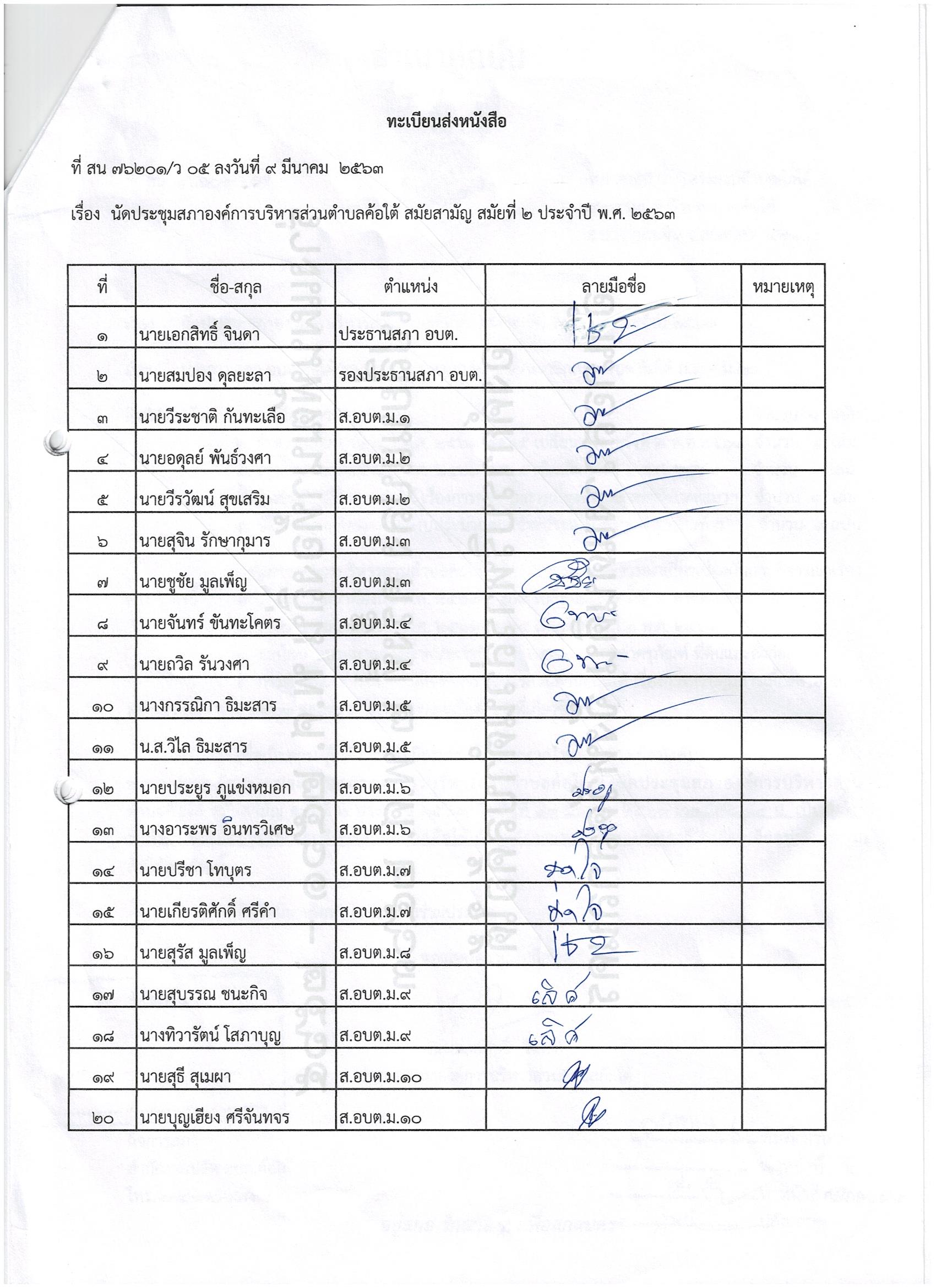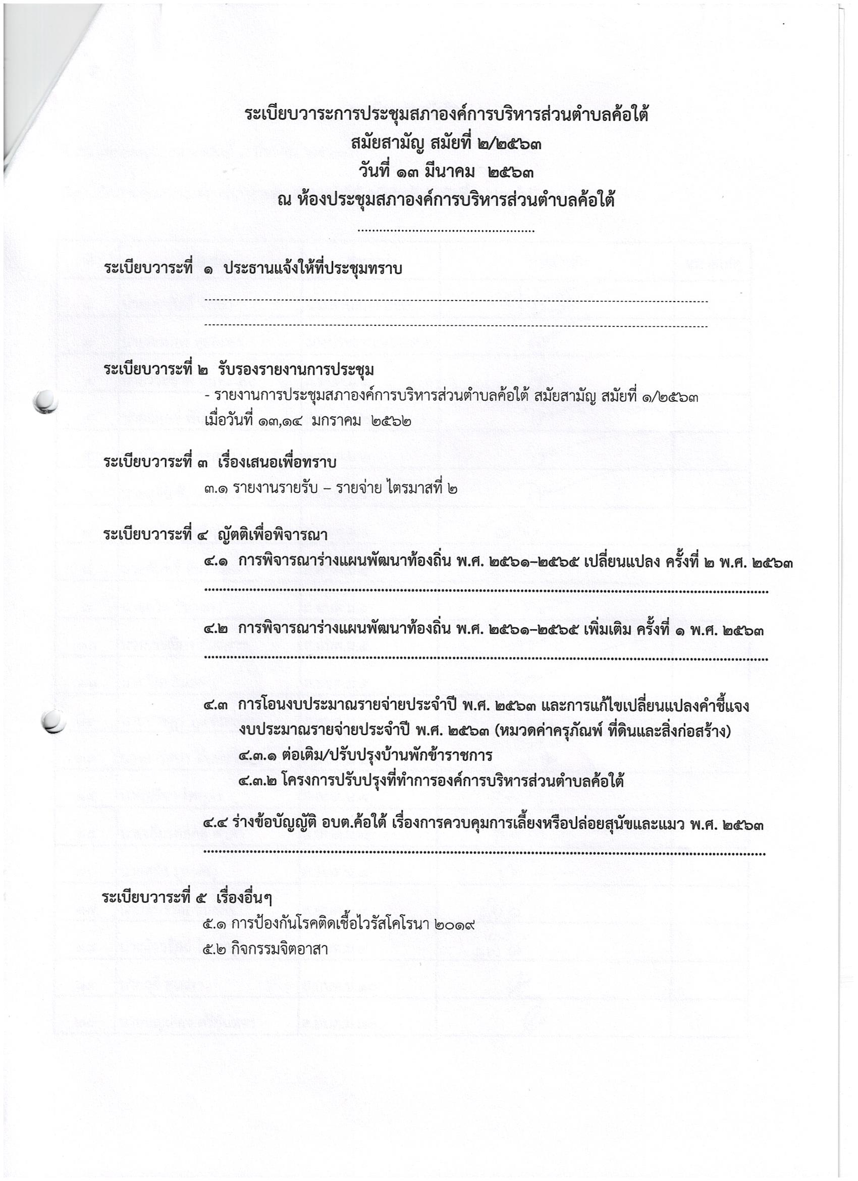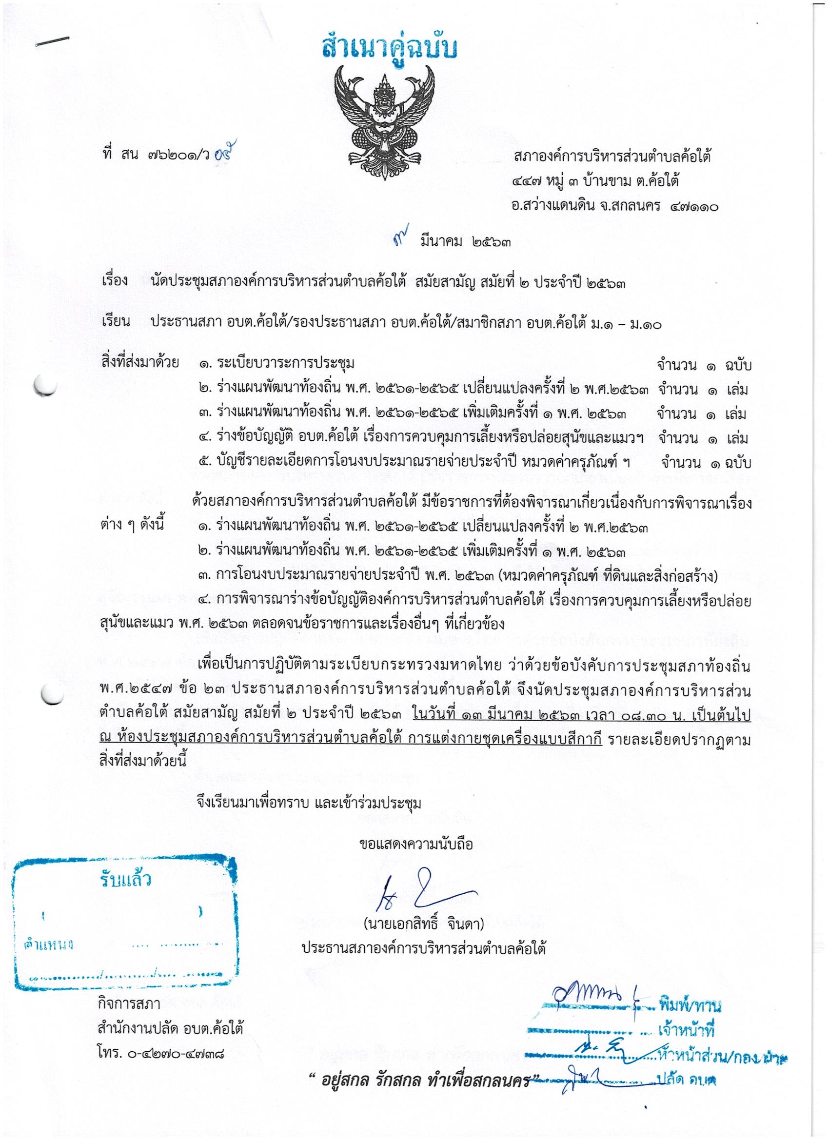 หนังสือนัดประชุมสภาองค์การบริหารส่วนตำบลค้อใต้ สมัยสามัญ สมัยที่ 2 ประจำปี 2563