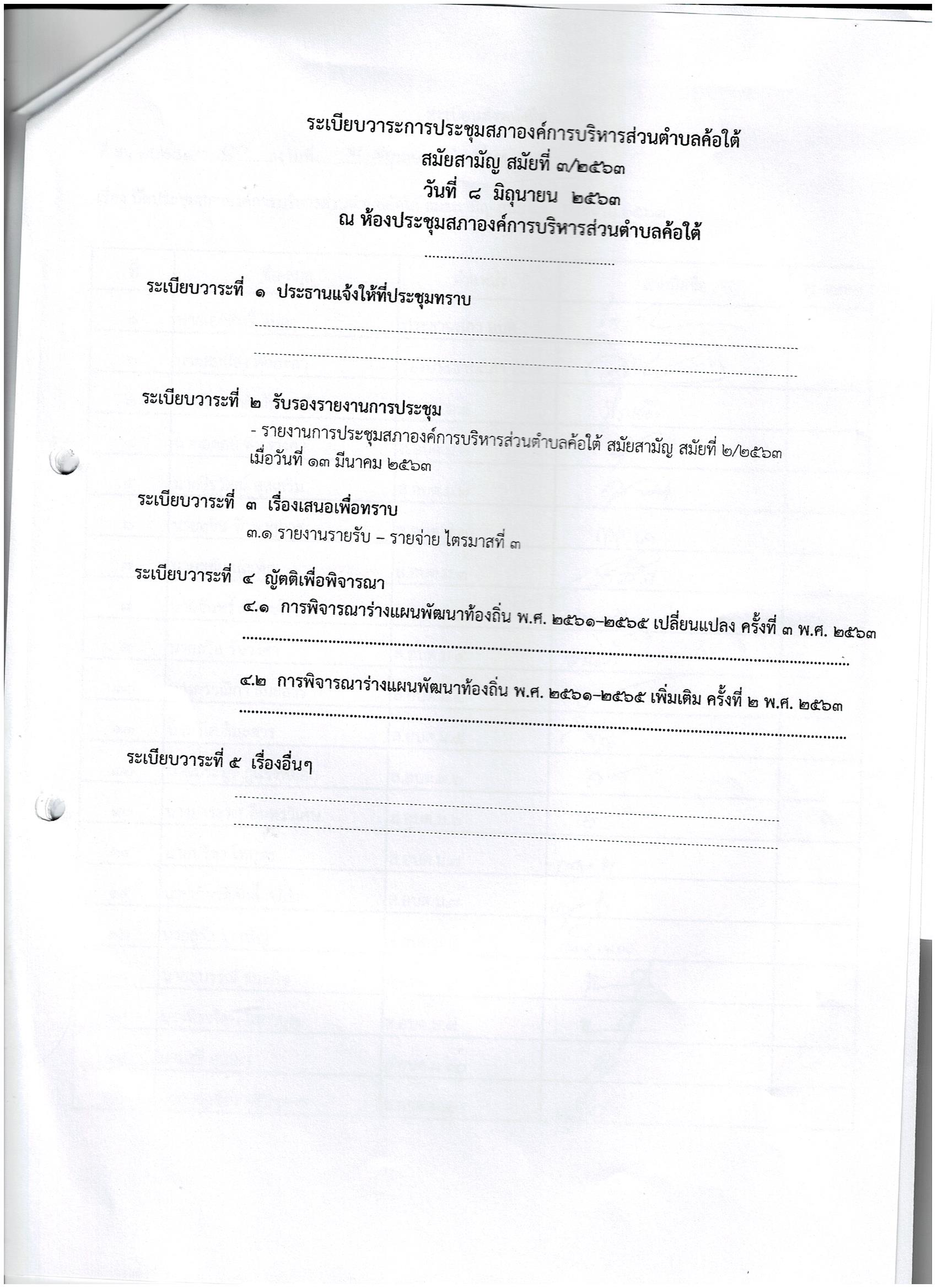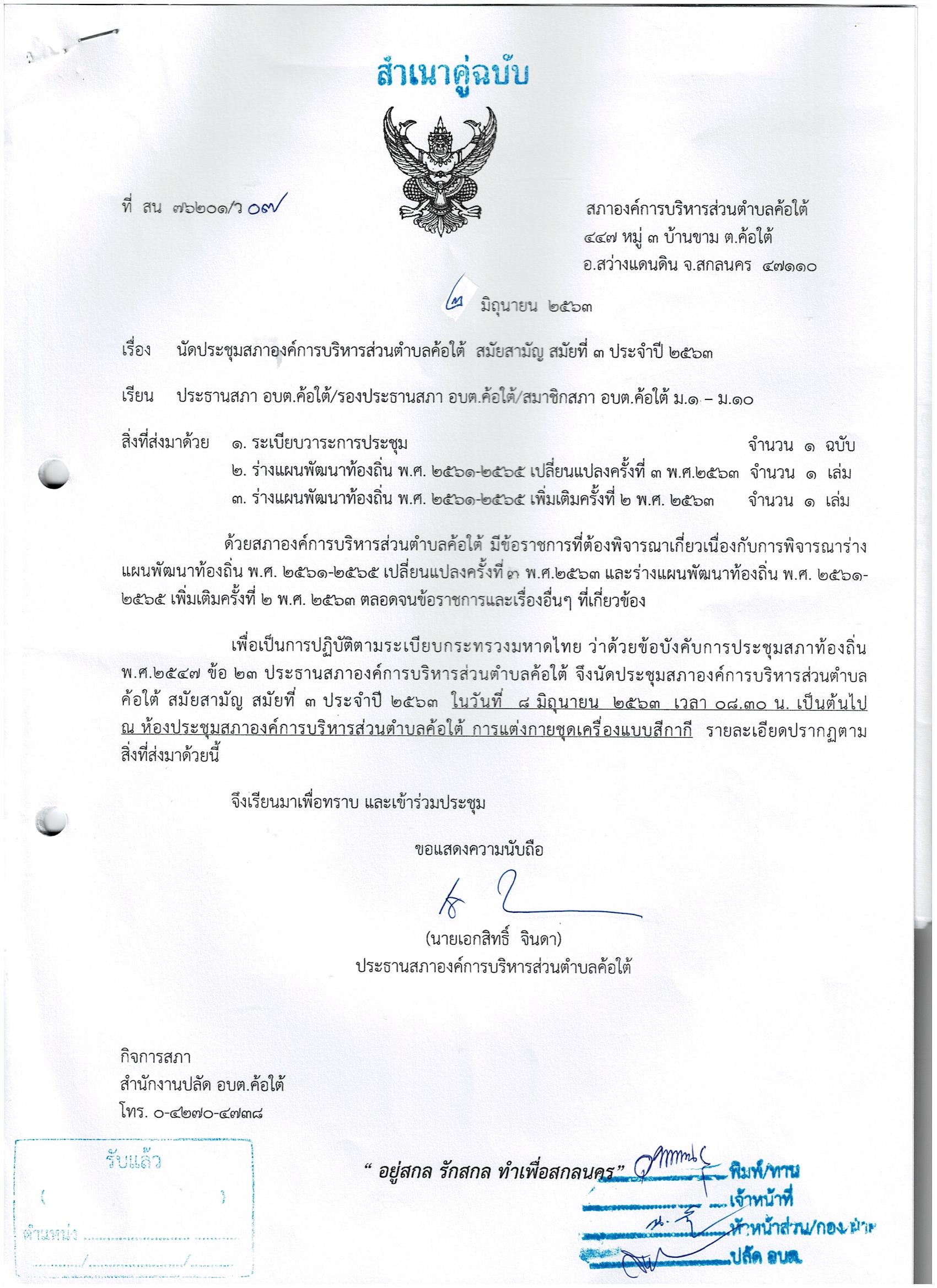 หนังสือนัดประชุมสภาองค์การบริหารส่วนตำบลค้อใต้ สมัยสามัญ สมัยที่ 3 ประจำปี 2563