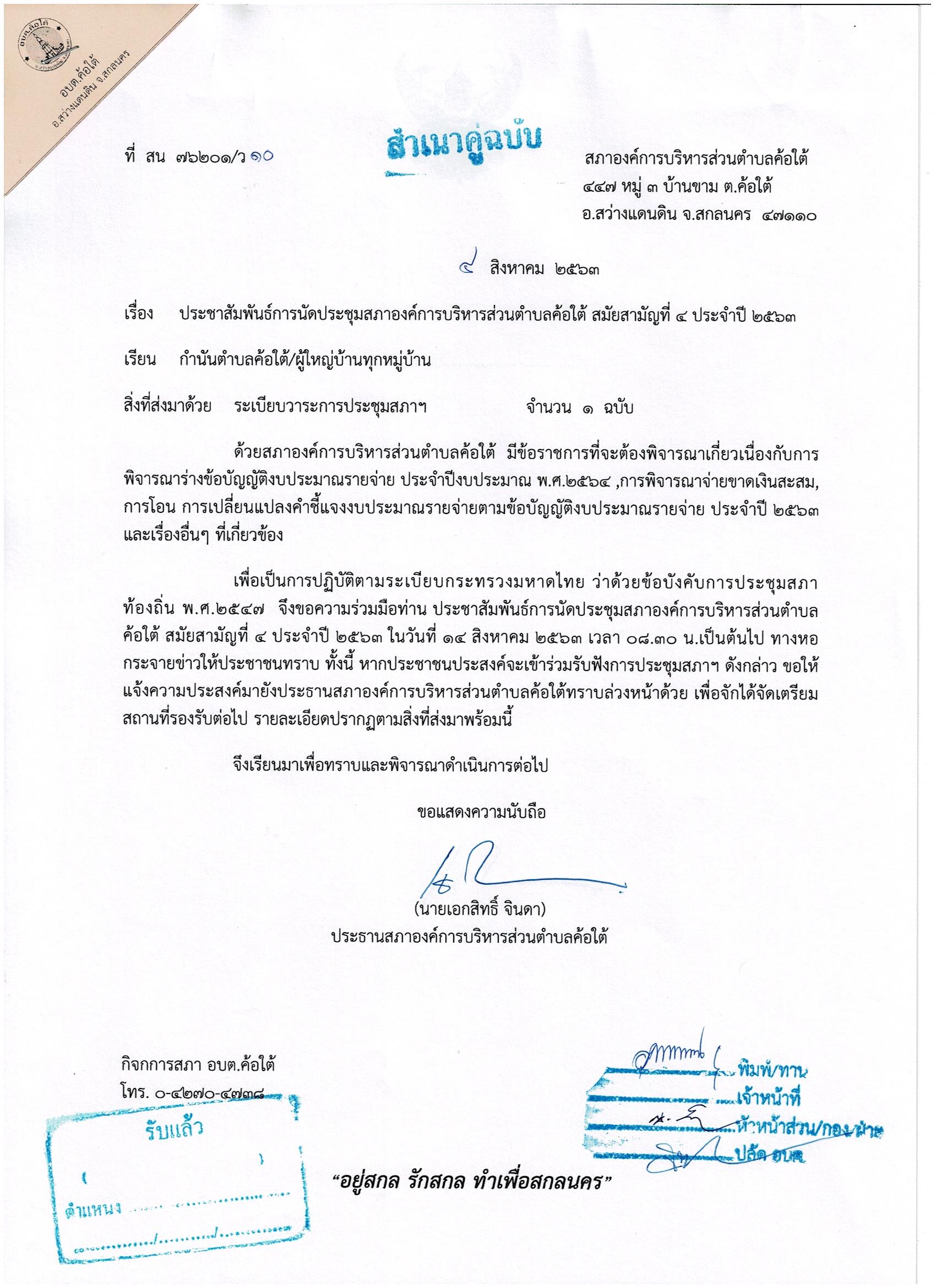 ประชาสัมพันธ์การนัดประชุมสภาองค์การบริหารส่วนตำบลค้อใต้ สมัยสามัญ สมัยที่ 4 ประจำปี 2563