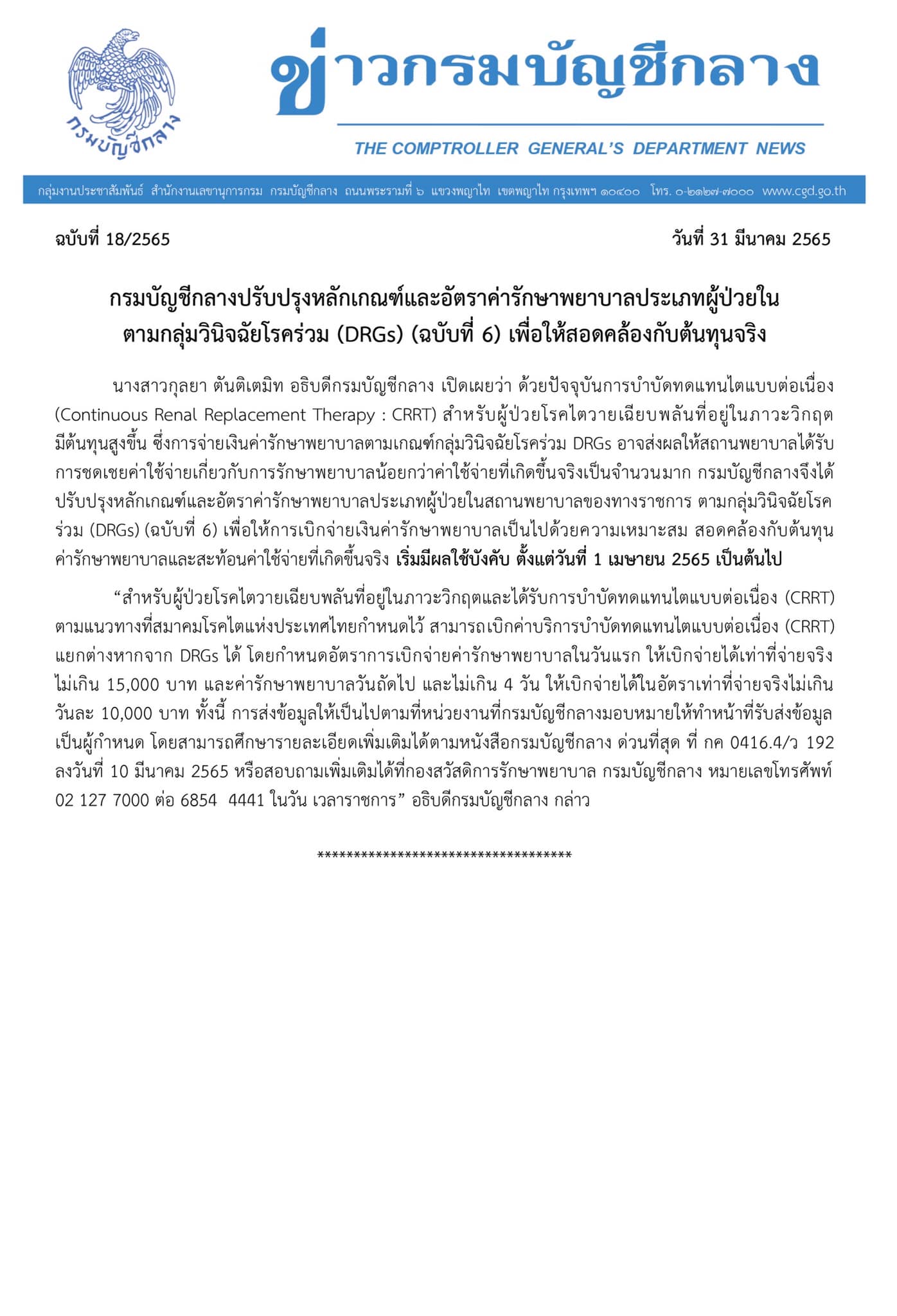 กรมบัญชีกลางปรับปรุงหลักเกณฑ์และอัตราค่ารักษาพยาบาลประเภทผู้แ่วยในตามกลุ่มวินิจฉัยโรคร่วม(DRGs) (ฉบับที่ 6) เพื่อให้สอดคล้องกับต้นทุนจริง