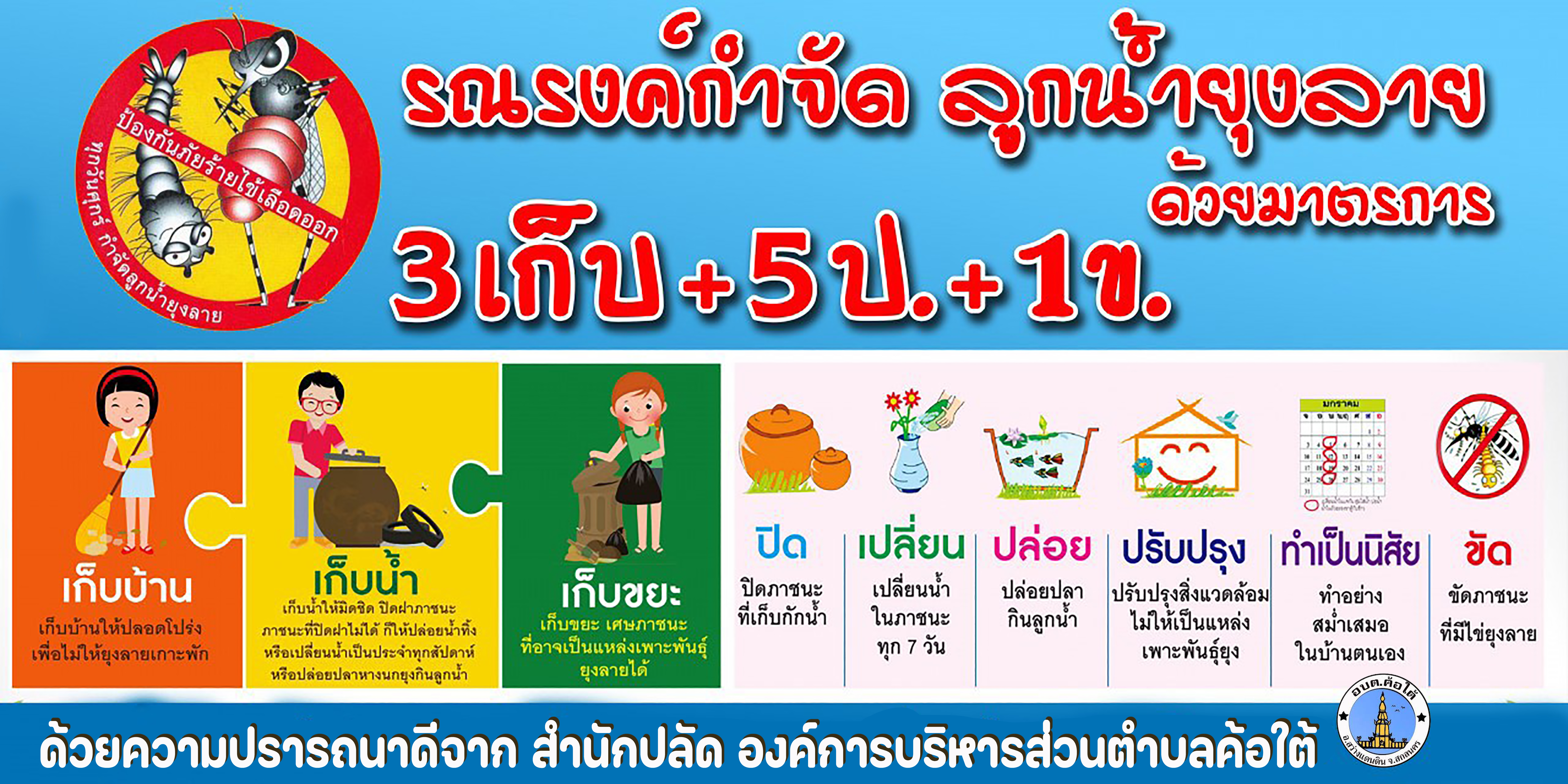 ชื่อเรื่อง : ขอเชิญชวนชาวตำบลค้อใต้ป้องกันโรคไข้เลือดออกและโรคที่ติดต่อทางยุง ด้วยการกำจัดลูกน้ำยุงลายตัวการนำโรค ตามมาตรการ 3 เก็บ + 5ป. + 1ข.