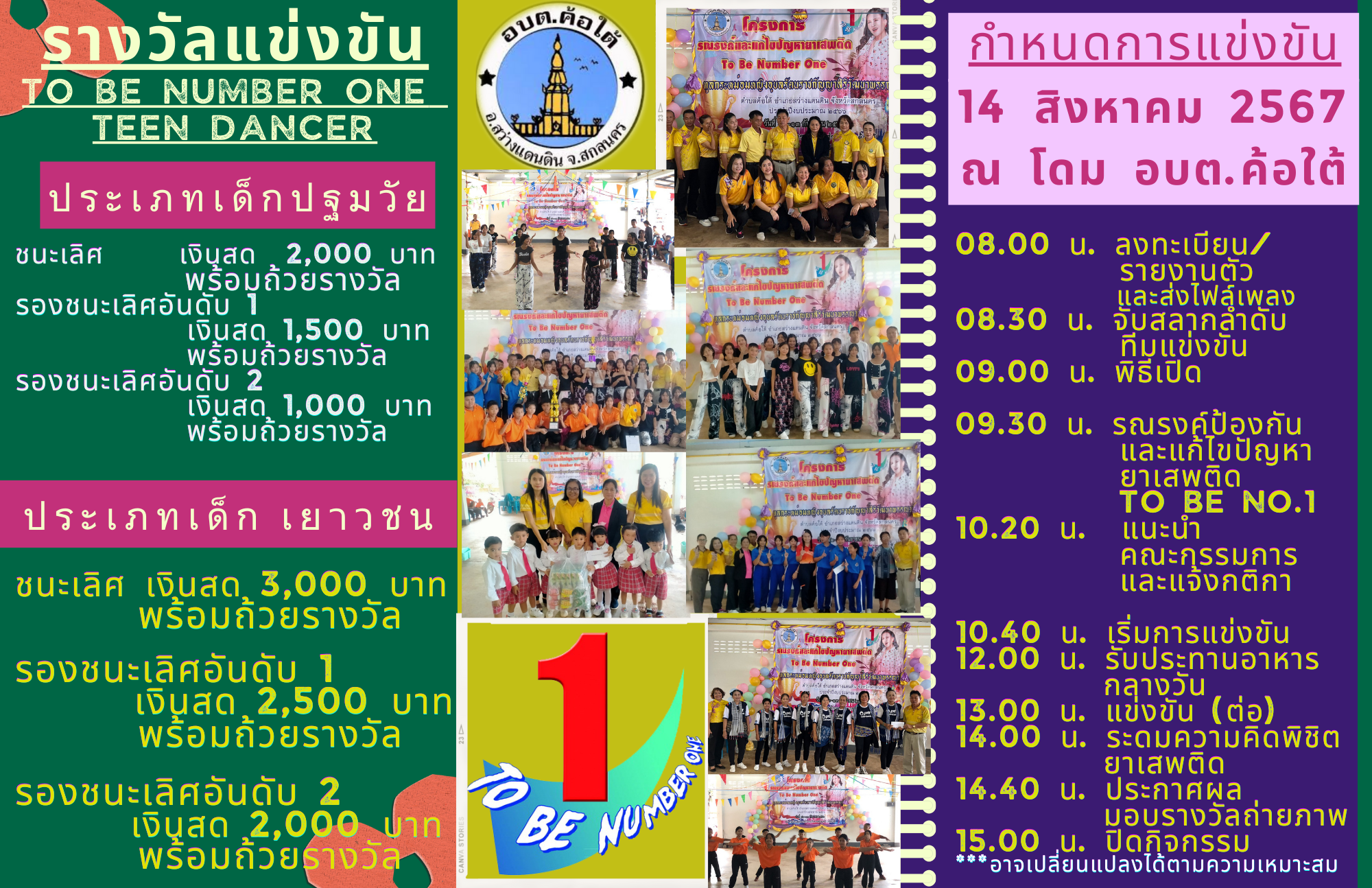 รายละเอียด : องค์การบริหารส่วนตำบลค้อใต้ ขอเชิญชวนเด็ก เยาวชนสมัครเข้าแข่งขัน TO BE NUMBER ONE TEEN DANCER ตามโครงการรณรงค์และแก้ไขปัญหายาเสพติด To Be number one ประจำปี 2567 รายละเอียดตามเอกสารประชาสัมพันธ์แนบมาพร้อมนี้