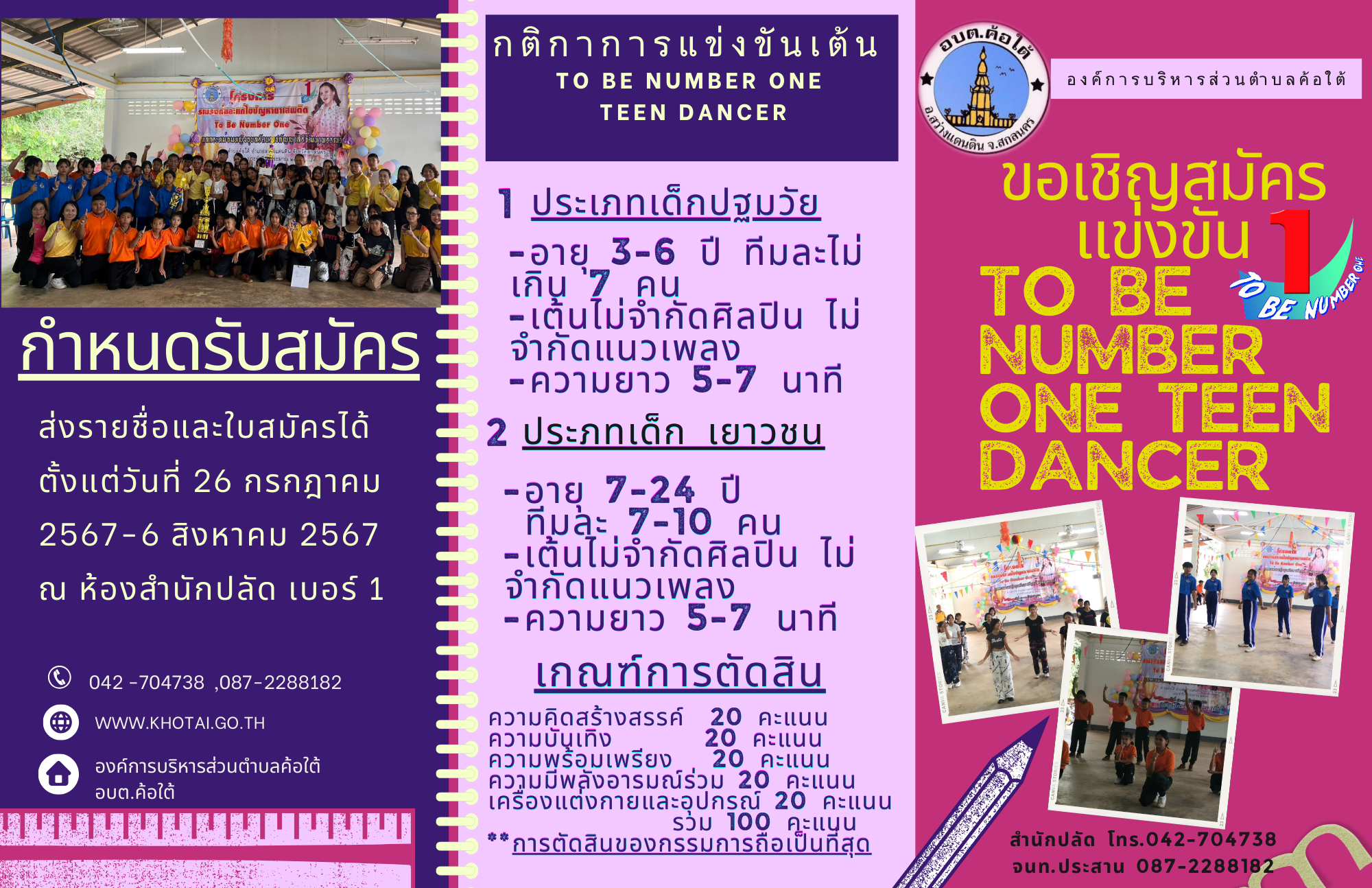 ชื่อเรื่อง : องค์การบริหารส่วนตำบลค้อใต้ ขอเชิญชวนเด็ก เยาวชนสมัครเข้าแข่งขัน TO BE NUMBER ONE TEEN DANCER