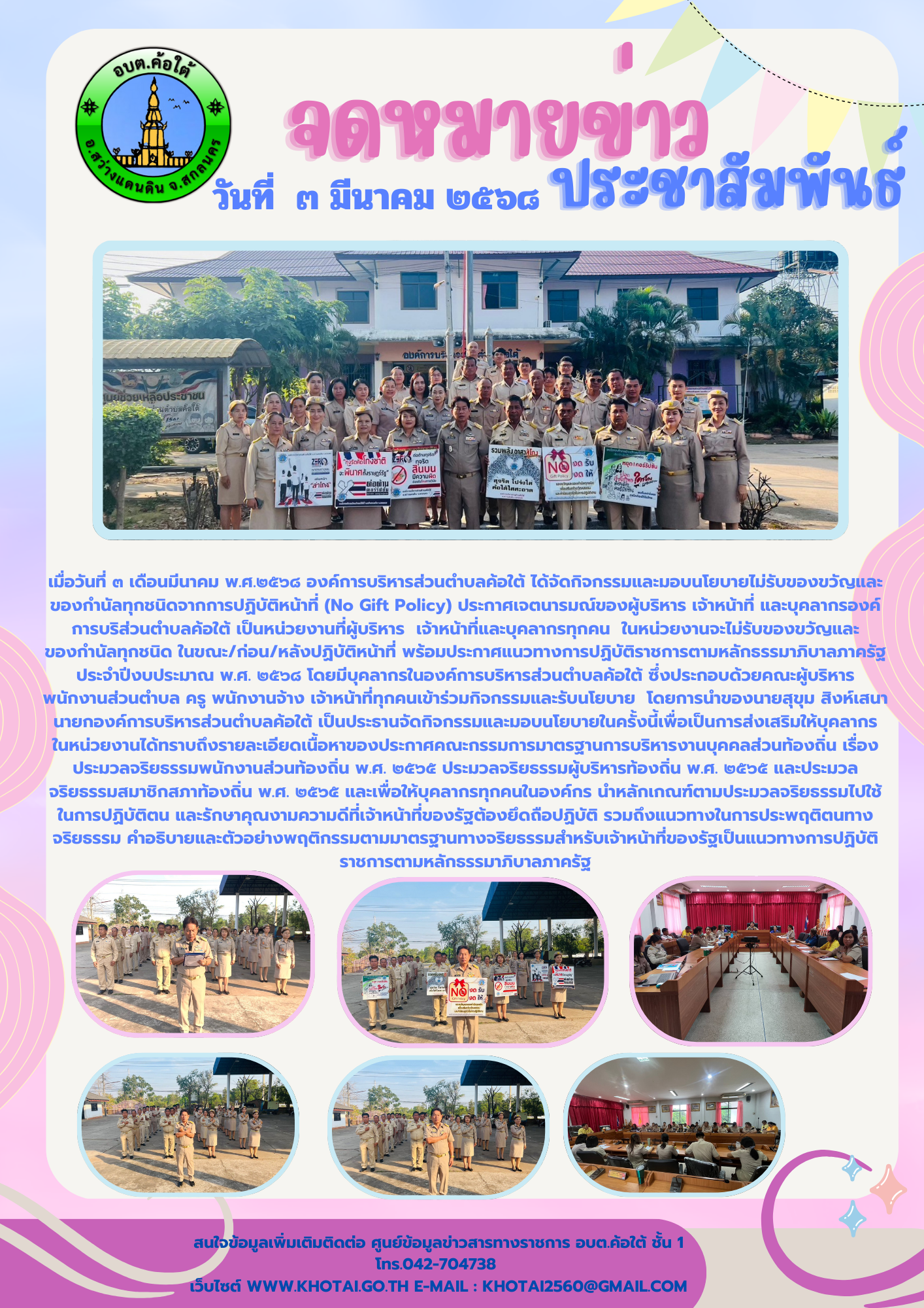 จดหมายข่าว การเสริมสร้างมาตรฐานทางจริยธรรมให้แก่เจ้าหน้าที่ขององค์การบริหารส่วนตำบลค้อใต้