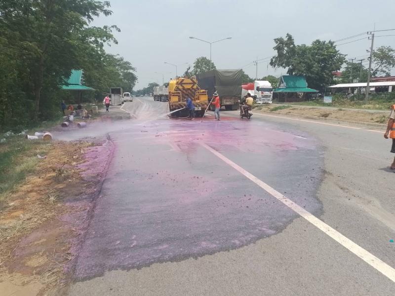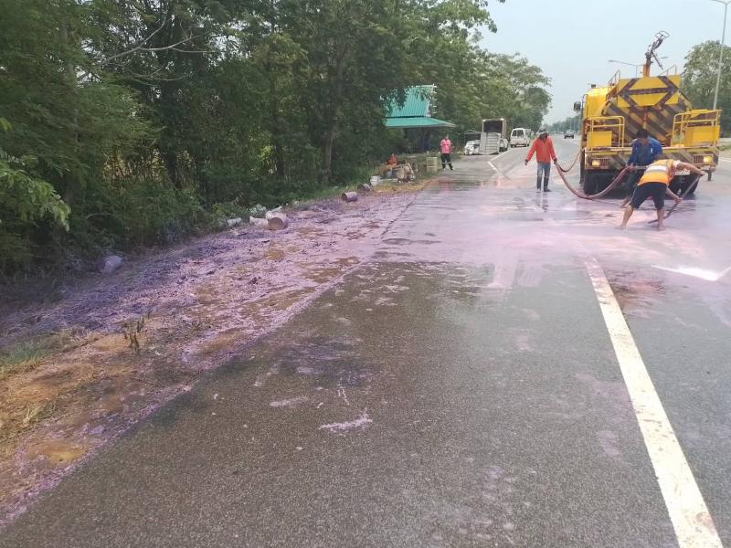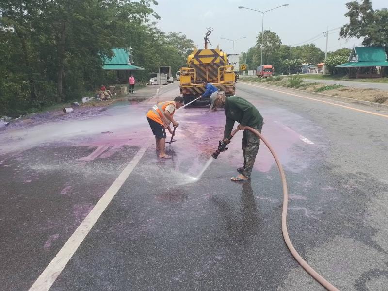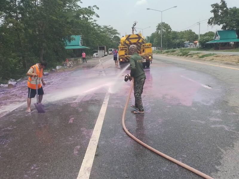 งานป้องกันและบรรเทาสาธารณภัยองค์การบริหารส่วนตำบลค้อใต้ลงพื้นที่ฉีดล้างถนนบริเวณหน้าเรือนจำอำเภอสว่างแดนดิน เนื่องจากรถบรรทุกสียางระเบิด