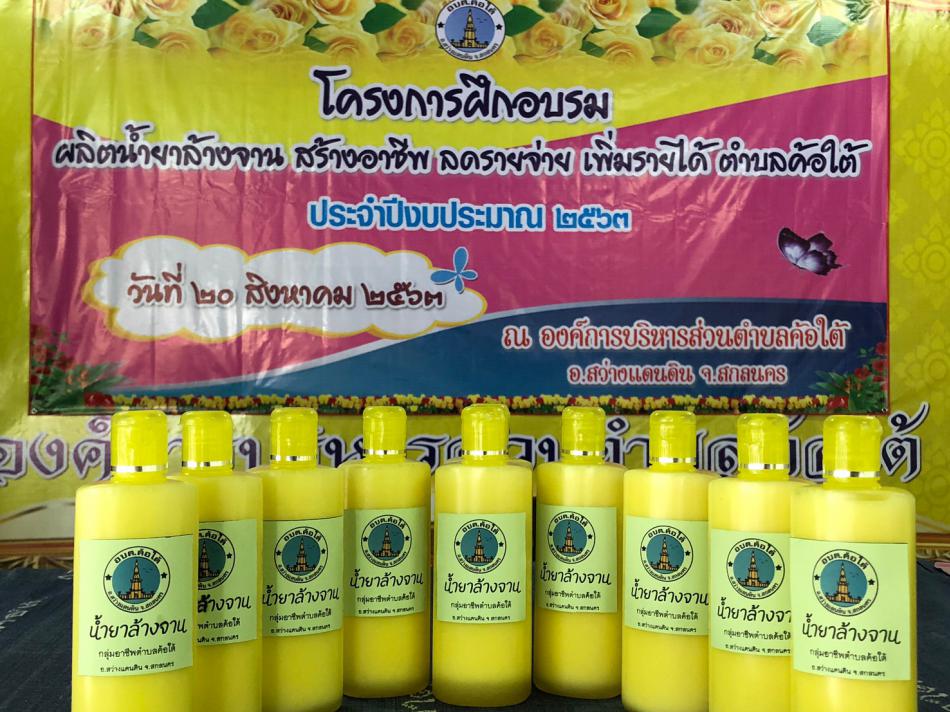 วันที่ ๒๐ สิงหาคม ๒๕๖๓ องค์การบริหารส่วนตำบลค้อใต้ดำเนินโครงการฝึกอบรมผลิตน้ำยาล้างจาน สร้างอาชีพ ลดรายจ่าย เพิ่มรายได้ ตำบลค้อใต้ ประจำปีงบประมาณ พ.ศ. ๒๕๖๓