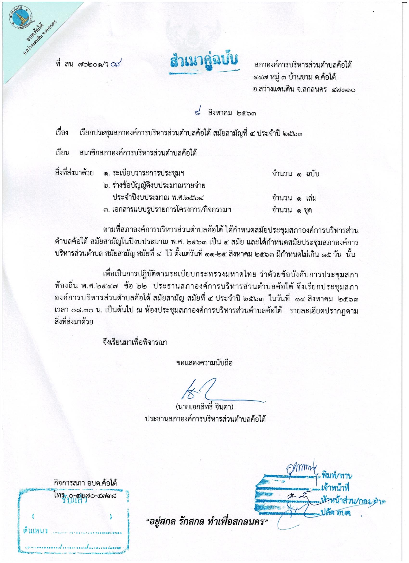หนังสือเรียกประชุมสภาองค์การบริหารส่วนตำบลค้อใต้ สมัยสามัญ สมัยที่ 4 ประจำปี 2563